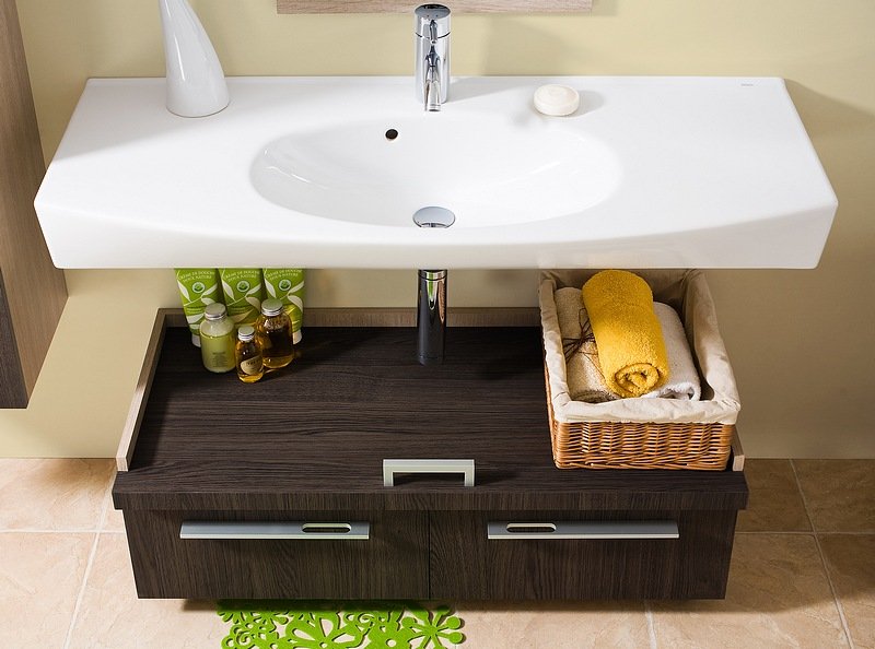 Seria Madera to wyjątkowa seria mebli w dwóch kolorach. Praktyczne meble na kółkach umożliwiają aranżację wnętrza w zależności od nastroju, wynikających potrzeb lub zmieniających się upodobań. Dodatki typu lampka w regale, funkcjonalny wkład porządkujący do szuflady, wiklinowy koszyk oraz wieszaki na ręczniki sprzyjają ergonomicznemu wykorzystaniu łazienki. Zamontowany system cichego zamykania szuflad i drzwiczek podwyższa komfort użytkowania