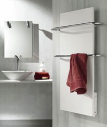 Pionowe grzejniki granitowe dostępne są także w wersji łazienkowej z chromowanymi lub białymi relingami na ręczniki. Elegancja, która zapewnia ciepło w łazience i przytulnie podgrzane ręczniki.