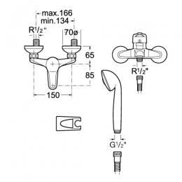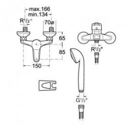 Dane techniczne 1 | Montaż dwuotworowy, przyłącze mimośrodowe, ceramiczna głowica z możliwością ograniczenia maksymalnej temperatury i wypływu wody, perlator, przełącznik wannanatrysk, słuchawka natryskowa z wężem o długości 170 cm i uchwytem ściennym. |