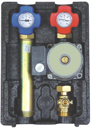 Kompaktowa grupa pompowa SA 90 - DN 20 wyposażona jest w trzy mosiężne zawory kulowe w tym dwa z termometrami wody zasilającej (rączka czerwona) i powrotnej (rączka niebieska), łącznik z zaworem zwrotnym i izolację. Na życzenie grupa może być wyposażona w pompę WILO, grupę z zaworem różnicy ciśnień (przelewowym) T20, oraz w uchwyty do zamontowania grupy na ścianie S20.